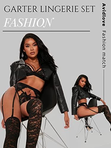 Avidlove Women lace lingerie set features sheer lace cups with strappy detail, satin bow accents, adjustable spaghetti straps, a hook back closure, a matching high waisted garter belt with adjustable garter straps.