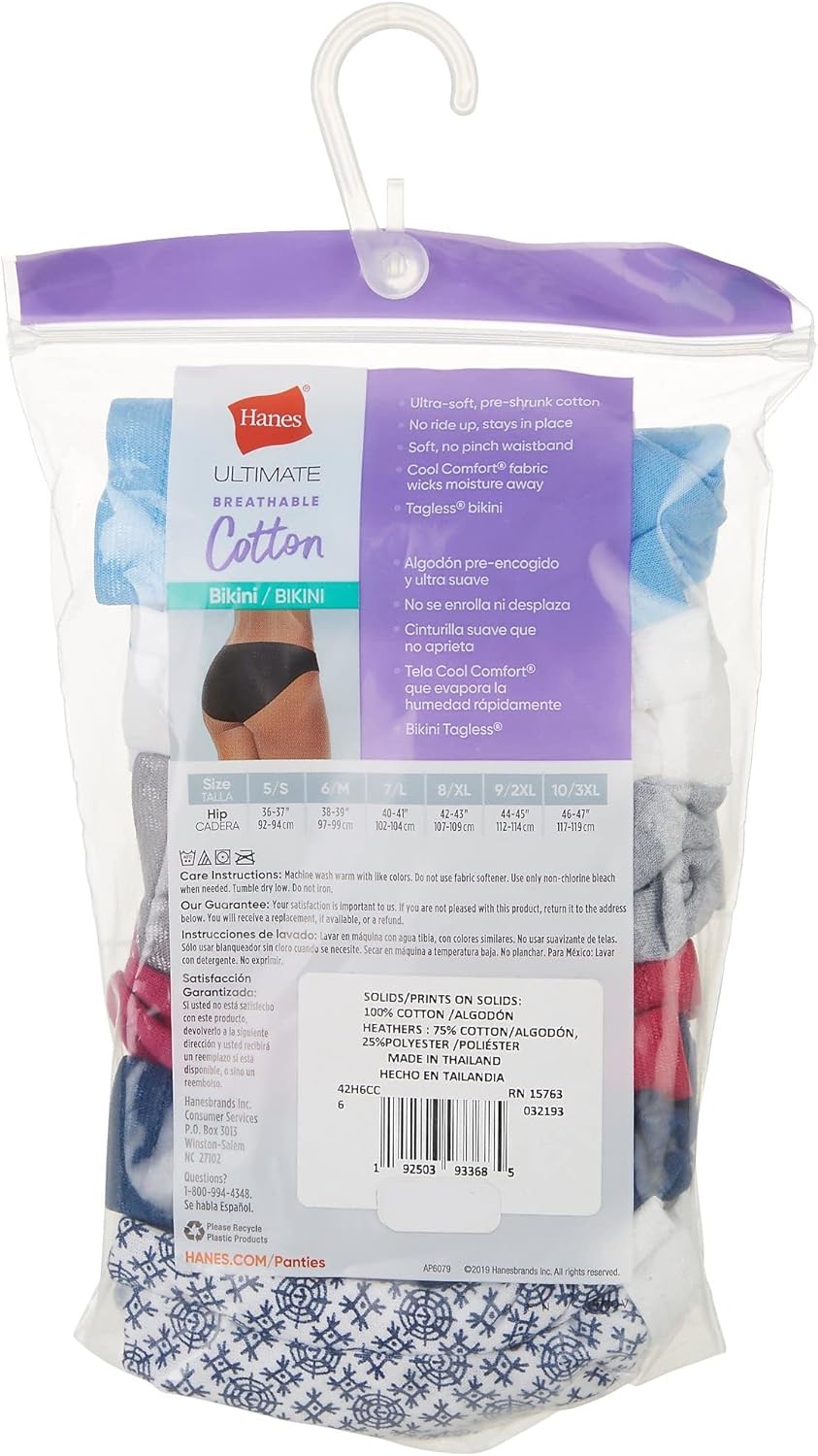 Hanes Ultimate Women’s 6-Pack Breathable Cotton Bikini Panty, Swiss Blue, White, Concrete PE Heather, Fresh Berry, Navy Eclipse, Crochet Boho Print, 8