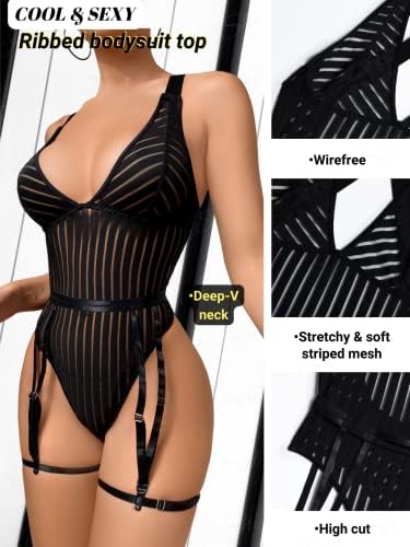 Kaei&Shi Sexy Ribbed Top,Plunge V, Snap Crotch, Leg Strap, Backless 3Pc Bodysuit