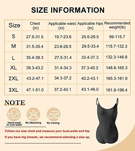 【Warm Tips】Please notice it before placing an order. Follow our size chart and measure your bust,waist and hip. You may be surprised how “tiny” the bodysuit looks during 1st time try-on. But don’t worry, the bodysuit is purposely designed with super stretchy fabric, and the adjustable elastic shoulder straps let you adjust the shaping bodysuit for women for a perfect fit.
