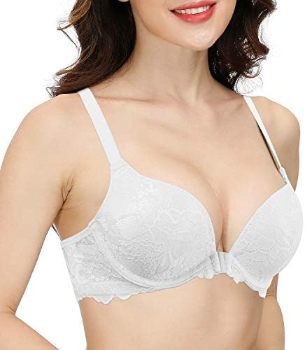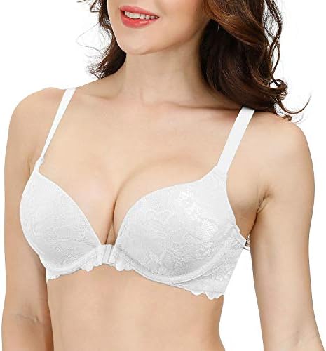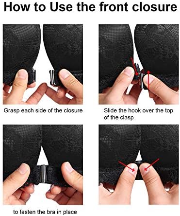 How to use the front close bra: 1.Grasp each side of the closure. 2.Slide the hook over the top of the clasp 3. to fasten the bra in place. Size 30-44A/B/C/D/E/DD. Kindly mind: It’s a front closure push up bra and not adjust the width around back band, please measure and refer to the size chart for an ideal fit.