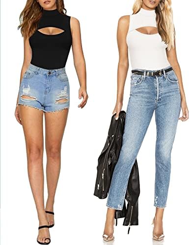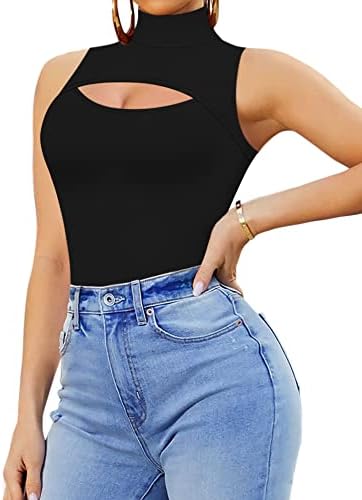 MANGOPOP Mock Neck Sexy Cutout Front T Shirt Sleeveless Long Sleeve Short Sleeve Bodysuit for Women