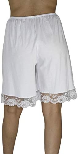 Comfort and freedom are yours in this beautiful lace trimmed pettipants.Cotton Knit.Length from 19 inches in small to 22 inches in the larger sizes. 9-inch inseam.Machine washable.Made in USA.Formaldehyde free lace!