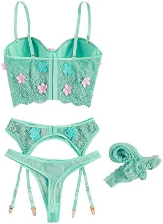 Features: garter lingerie for women with stocking, floral appliques, lace contrast, underwire, stocking lingerie set, embroidered lingerie, push up